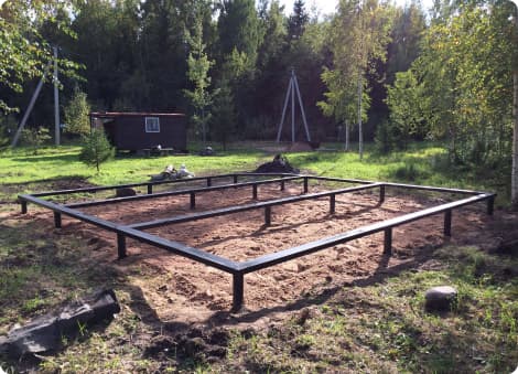 Монолитных плит, как и ленточных бетонных решений, не потребуется. Установок мокрого типа, заливку бетону, армирование — всё это исключается. Такой подход уменьшает сроки строительству и позволяет выполнить монтаж в любое время года. Надёжных креплений и устойчивости конструкции достаточно, чтобы выдержать сильные снеговые и ветровые нагрузки. Даже в случае временной постройку, фундамент легко демонтируется или усиливается.