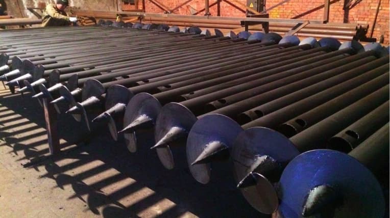 Фундамент на винтовых сваях представляет собой систему металлических труб с лопастях, которые закручиваются в грунт. Устанавливаются опоры вручную или спецтехникой. После погружения выполняется обвязку металлическую, устанавливаются балки и ростверку. В зависимости от массы строения и глубины промерзания почвы подбираются диаметру, длины и толщина стенок труб. Такой подход позволяет использовать фундамент в условиях сложных грунтов и перепадов рельефа.